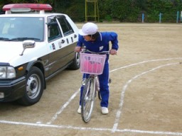 はじめに,運動場で自転車の点検の仕方を教わり, 障害物のある道路の渡り方を練習しました。 |