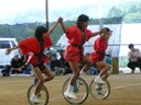一輪車の技もどんどん上達しています。今年も曲に合わせ,リズムに乗ってバック走行や,スピン,片足走行,アイドリング,そしてみんなで手をつないでくぐりあったり,回転をしたりしました。 観客席の皆さんにも上達ぶりをほめていただけました。 |