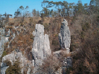 布寄小の周辺は石灰岩地域になっていて, 上の石灰岩の石塔が一対そびえ立っています。 寄り添うさまから夫婦岩とよばれています。 左が 婦岩 (高さ16メートル) 右が 夫岩 (高さ12メートル)です。 めずらしい石灰岩植物なども見られます。 |
